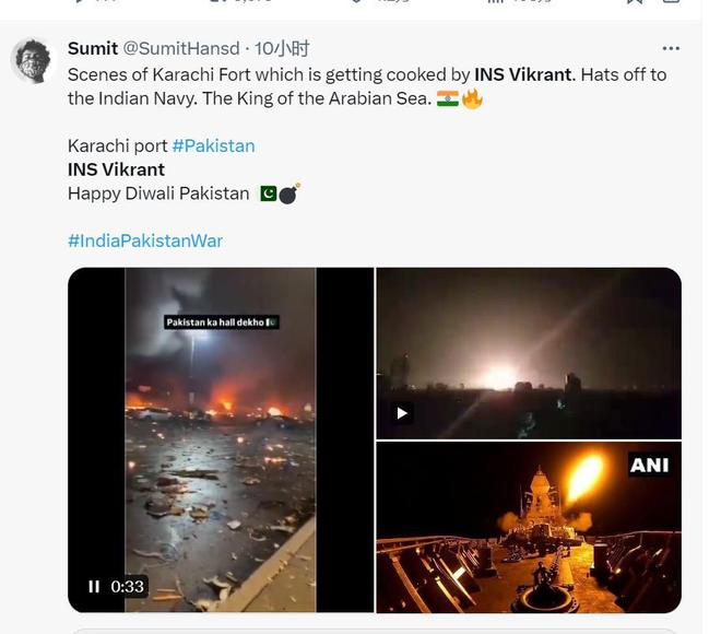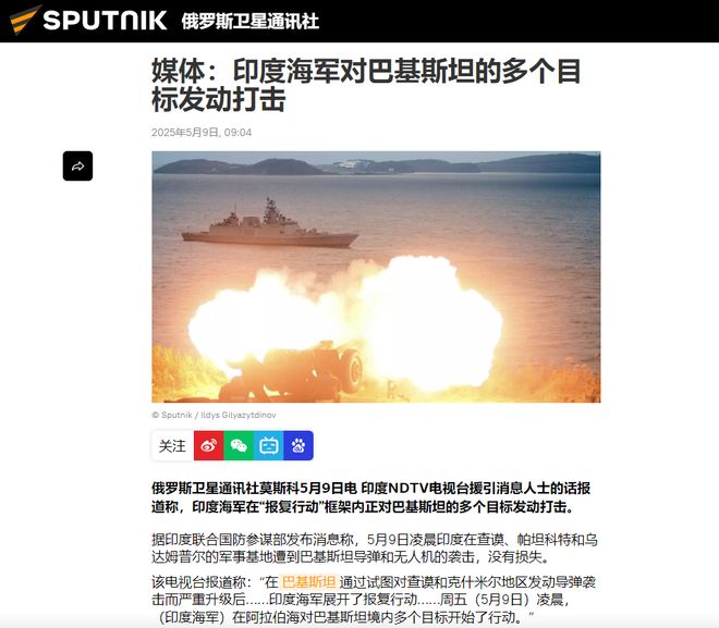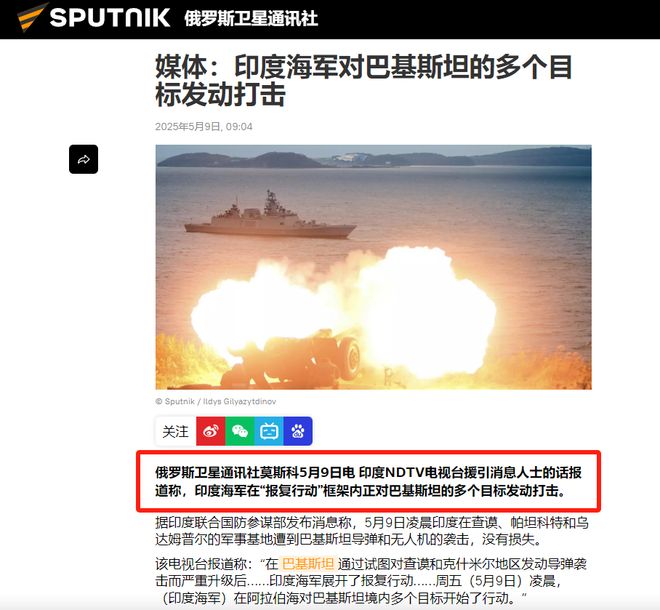根据俄罗斯卫星通讯社报道,印度NDTV电视台报道了印度海军参战的消息,对巴基斯坦沿岸的多个目标进行打击。